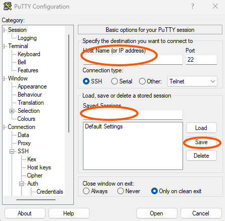 11. 이제 PuTTY를 열어줍니다. Host Name에는 EC2 인스턴스에서 퍼블릭 IPv4 주소를 입력해줍니다. 인스턴스를 클릭하면 세부정보를 볼 수 있는데, 가운데에 위치해 있을 것입니다. 복사하고 Host Name에 붙여넣어주세요. Saved Sessions에 원하는 이름을 넣고 Save를 눌러줍니다. 그럼 나중에 껐다 켰을 때도 Host Name이 유지가 됩니다.