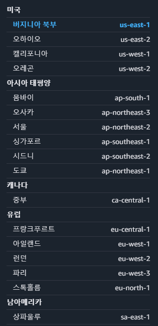 AWS 리전은 전 세계에 위치한 독립적인 지리적 영역입니다. 리전은 물리적으로 분리된 데이터센터 그룹으로 구성되어 있으며, 각 리전은 다른 리전과 완전히 독립적으로 운영됩니다. (기본적으로 버지니아 북부로 설정되어 있습니다.)