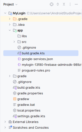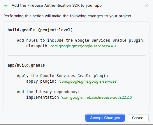 바꾼다고 달라지는 건 맨 아래 초록색 글씨인 Firebase의 auth 라이브러리를 우리 어플에 쓸 수 있게 하겠다 뿐입니다