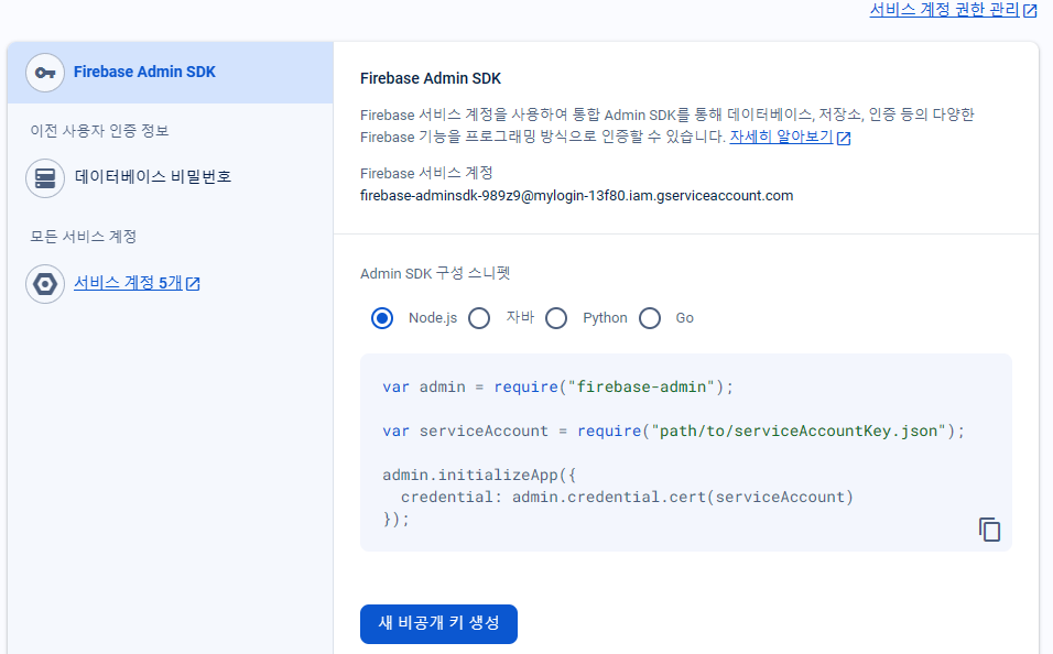 그럼 또 슈루룩 페이지가 이동되면서 자동적으로 service accounts 페이지로 넘어옵니다!
