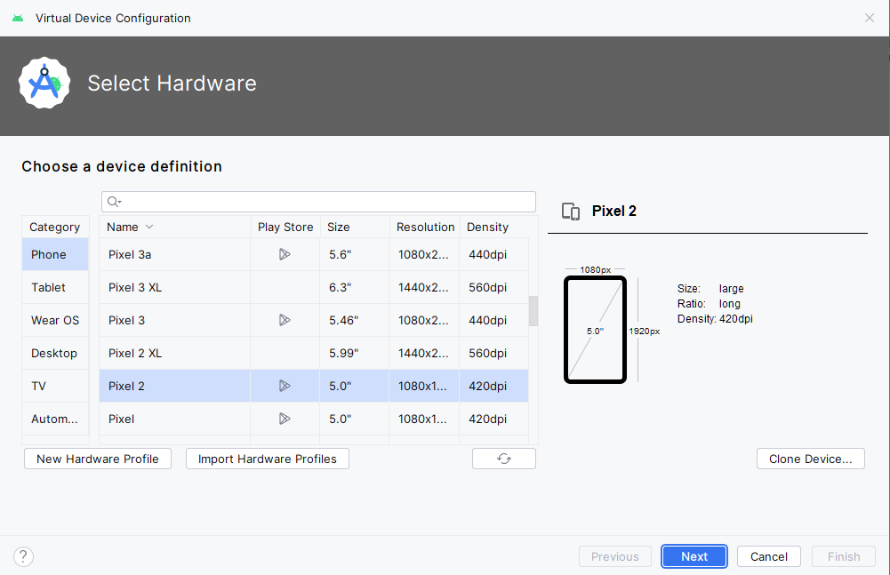 Phone에 Pixel 2를 클릭하고 Next를 누릅시다!