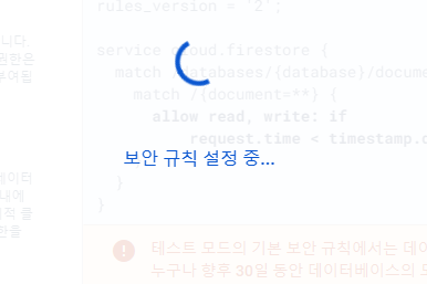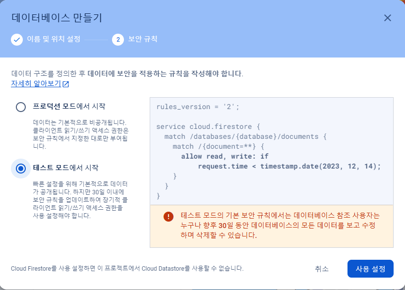 테스트 모드는 보안 규칙을 수정할 수 있기 때문입니다! 사용 설정을 눌러줍니다!