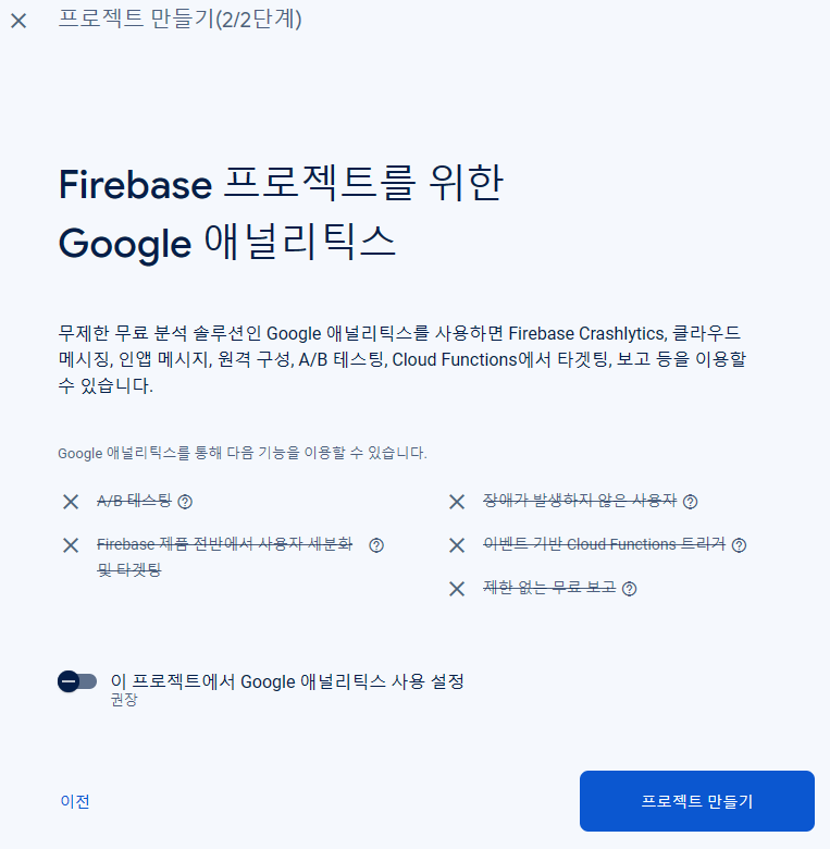이 프로젝트에서 Google 애널리틱스 사용 설정을 꺼버렸기 때문입니다 ㅎ