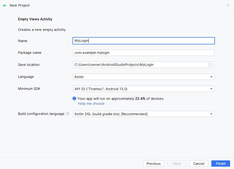 Activity를 선택하고 나면 전체적인 프로젝트의 이름을 설정할 수 있는데 기본적으로 My application이라고 바로 나타납니다. 로그인할 프로젝트이므로 저는 MyLogin이라고 지어줬습니다. 그리고 Finish를 눌러줍니다.