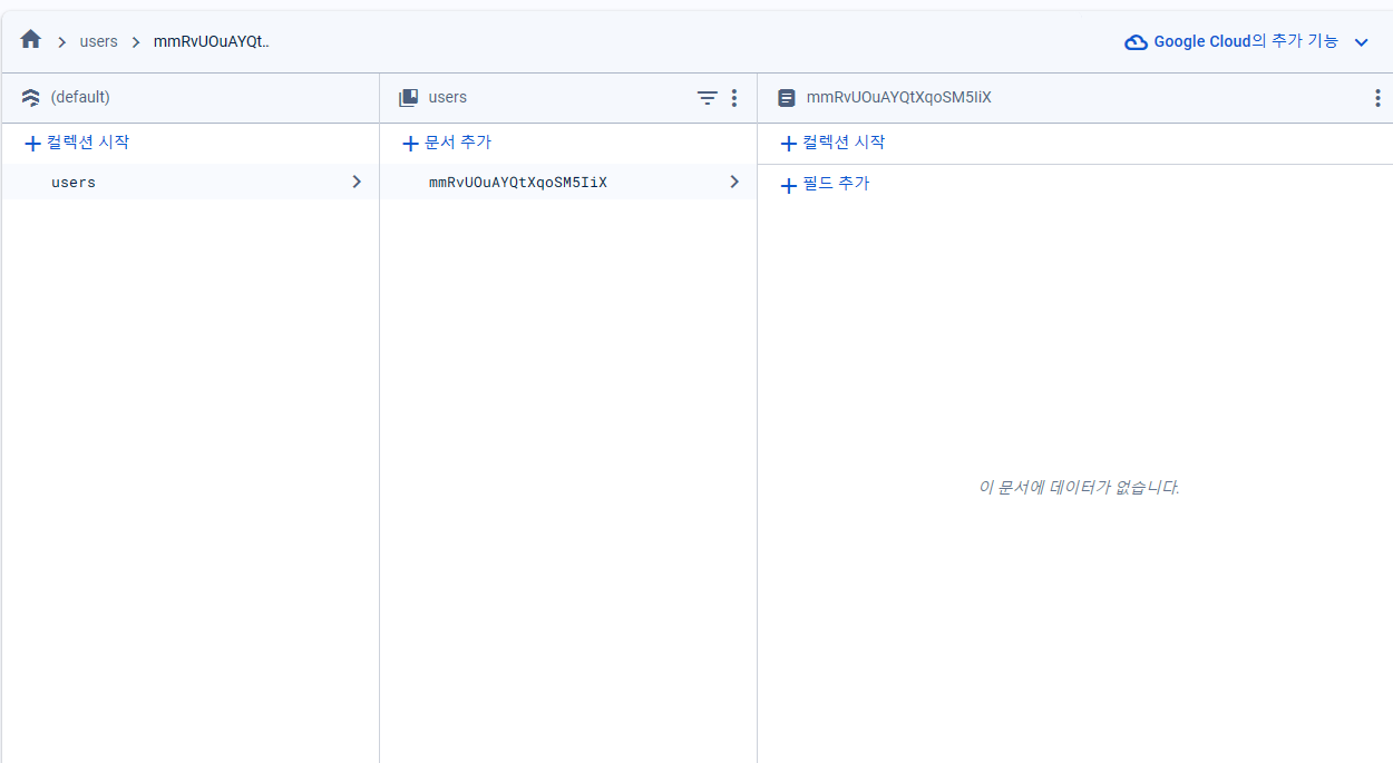 이런 화면이 뜨고 여기에 users라는 컬렉션 안에 회원가입 정보들을 저장할 것입니다!